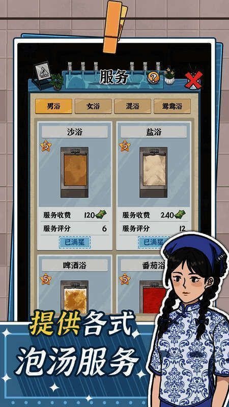 在游戏中,玩家需要合理采购物资,确保浴场正常运转;不断优化服务流程,提高顾客满意度;积极解锁新设施,保持浴场的新鲜感。通过持续改进,吸引更多顾客光临,提升营收水平。