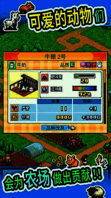 1、逐步种植动物、花卉、蔬菜、水果,雇佣员工,开设新店吸引顾客游玩。2、在游戏中,用心提升动物和农作物等级,研究设施建设位置,探寻景点,争取获胜。3、提升牧场吸引力后可参加比赛,取得佳绩,吸引更多顾客。4、像素农场模拟乡村生活,重拾儿时闲暇时光,让农场订单稳定。