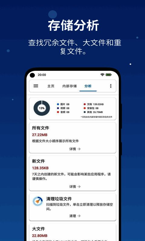 该软件不仅支持主流文件格式,还能识别并处理多种特殊格式文件,展现出强大的兼容性。同时,它内置存储优化功能,可智能扫描并清理缓存、临时文件、冗余数据等无用内容,有效释放手机空间,提升设备运行流畅度,延长手机使用寿命。