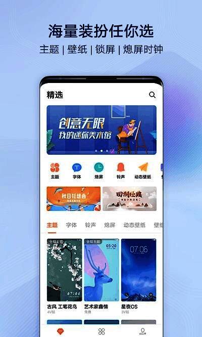 用户可前往应用商店下载安装i主题app,进入后可通过“主题”、“壁纸”、“字体”、“铃声”等模块自由选择内容,轻松定制属于自己的个性化手机界面。