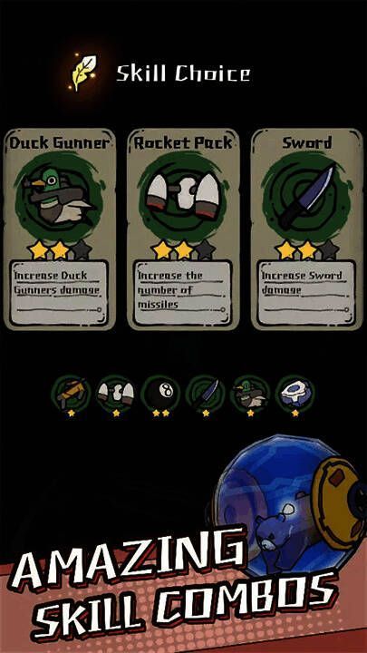 本作采用自动攻击机制,玩家通过横向卷轴视角进行战斗,操作简单直观。除了基础射击外,还可以利用弹跳机制躲避敌方攻击,展现灵活走位技巧。击败敌人后获得的经验可用于升级角色,同时收集“羽毛”资源以解锁新武器卡牌,增强战力。最终目标是克服重重难关,挑战并击败强大的Boss级敌人,完成整段冒险旅程。
