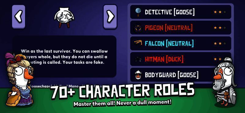 游戏最引人入胜的部分之一是其丰富的职业系统,涵盖了鹅阵营、鸭子阵营以及中立角色三大类别。每个角色都有专属技能与胜利条件,例如正义使者只能击杀一次敌人,警长则需谨慎判断敌我;而作为中立角色的秃鹫,则需要依靠吃掉尸体来赢得胜利。这种多元化的职业设计极大地提升了游戏的策略性和可玩性。