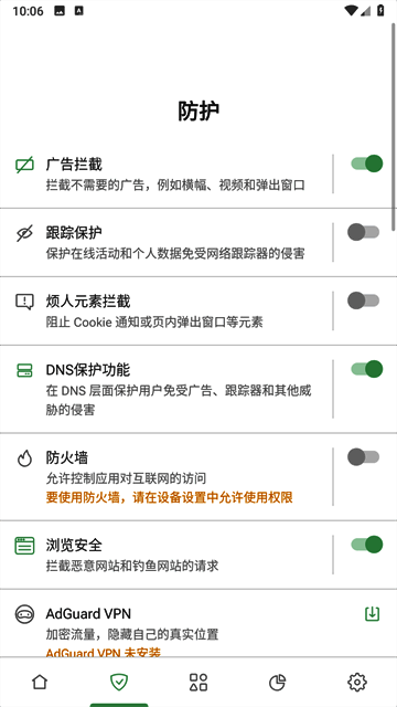 AdGuard是一款独具特色、无需获取根权限的广告拦截程序。它能有效移除应用和浏览器里的广告,全方位保护您的隐私,还能协助您管理应用。使用这款软件,能为您的手机上网之旅保驾护航,精准拦截危险程序与垃圾广告,让您畅享清爽上网体验。同时,它还能帮您减少一定的流量消耗,严格监控捆绑软件的下载安装,确保绿色安全上网。它具备全面的广告拦截和网页过滤功能,通过阻止网页上的广告、弹窗、恶意软件以及在线跟踪器,为您带来更清晰、更快速的浏览感受。