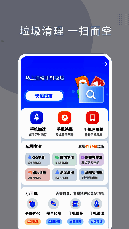 - 提升手机性能:清理垃圾和缓存,减少内存占用,加快手机速度。