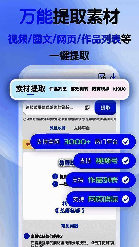 1. 【材料提取】支持全网3000多个流行平台,涵盖多种形式素材提取。
