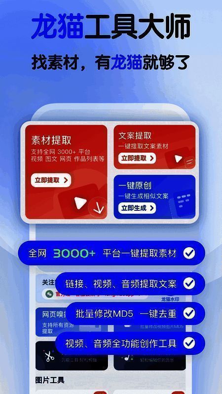 龙猫工具大师苹果手机版是一款免费好用的视频制作软件。它拥有海量剪辑素材资源,能实现图片拷贝的提取与转换。软件内容丰富,有多功能编辑助手,查找材料和摘录副本极为便捷。界面简洁又流畅,实用功能众多,是自媒体人必备的编辑工具。