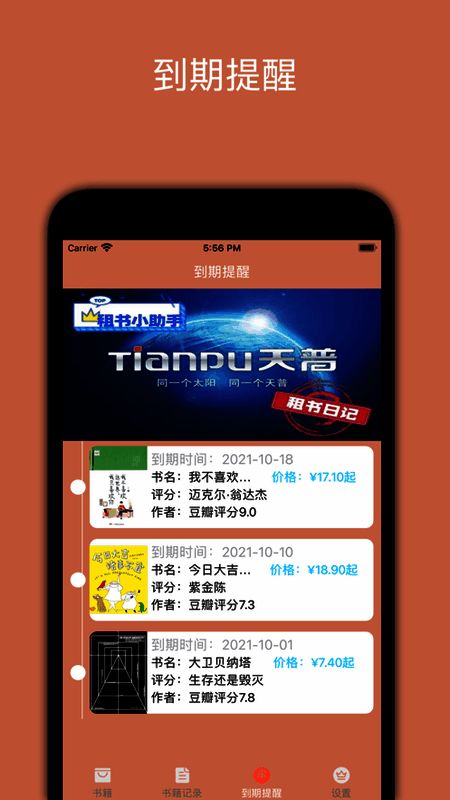 2、提供提前消息提醒功能,确保租书不会超时,避免产生罚款。