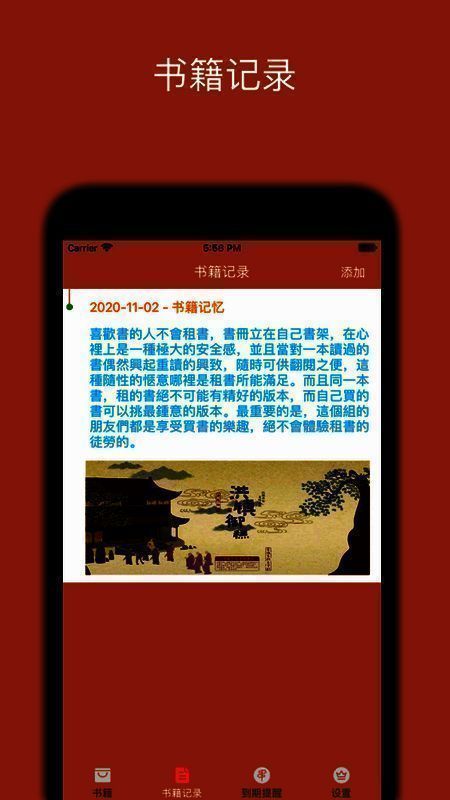 天普租书日记是专为图书馆工作人员打造的办公管理软件。用户能使用该软件设置图书借租日期,应用会自动提醒租借快到期的用户还书。此外,还能一键添加未出租书籍,填写基本信息后即可快速完成添加。它也是手机日记记录的好帮手,为大家带来诸多便利。感兴趣的小伙伴别再犹豫,快来试试吧!