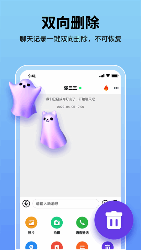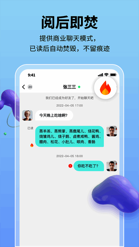 该聊天软件的聊天记录不可恢复,对方打开并阅读消息后,9 秒内消息会自动焚烧销毁,不留下痕迹,还禁止对方截屏,全方位保障用户资料安全。