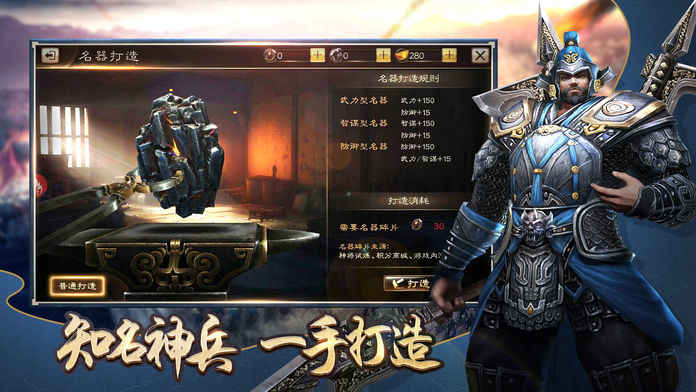 方天画戟、青龙偃月刀、青釭剑、丈八蛇矛等多种经典神兵武器,可随机打造。要亲手打造出神兵,既需实力,也靠运气。