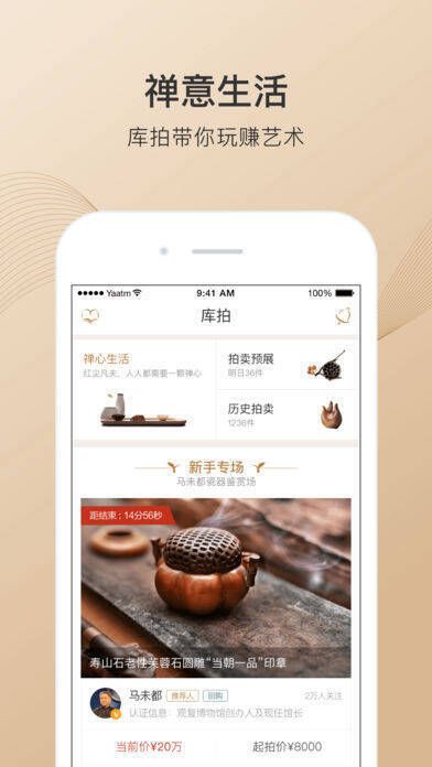 库拍整合了国内上百家知名文玩艺术机构,提供文玩、玉石、书法、水墨、当代艺术、茶禅、影像、油币、瓷器等众多拍品,价格跨度从千元到数十万元,投资门槛低,普通大众都能参与其中,共享艺术价值。