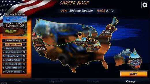 职业模式:历经108种艰苦的种族模式,从美国跑到澳大利亚,必须赢下每个系列才能进入下一阶段。很简单,赢了就能晋级。一路从普通赛车赢到顶级的410翼冲刺赛车,还能解锁奖励!控制方式:可从箭头、倾斜或虚拟触摸方向盘中选择。还有日/夜/黄昏赛车模式,可自由选择比赛时间!