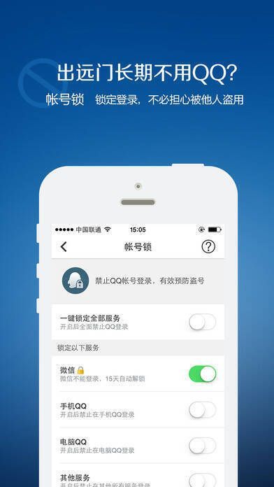开关操作自如,能全面掌控QQ登录。每次锁定最长15天,到期后会自动解锁。