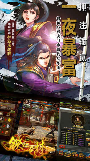 你想在全服乃至全区的侠士中声名远扬、荣耀加身吗?《铁血武林》助你登上万众瞩目的华山论剑舞台。只要玩家能跻身门派前三,就可参加当天的华山论剑,与其他门派的高手展开生死对决。登上华山论剑的玩家不仅能获得额外奖励,还能以武会友、拓展视野、提高声望,自在逍遥。游戏还为所有玩家开放了华山论剑助威功能,选择看好的高手助威,还有可能获得高额红书回报。快来与高手们争夺真正的王者之位吧!