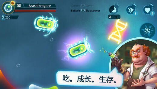 在微观世界模拟生存进化,探索微小细菌的乐趣。操控细菌移动觅食、对抗其他细菌,遵循适者生存法则,吃和生长以维持生存。