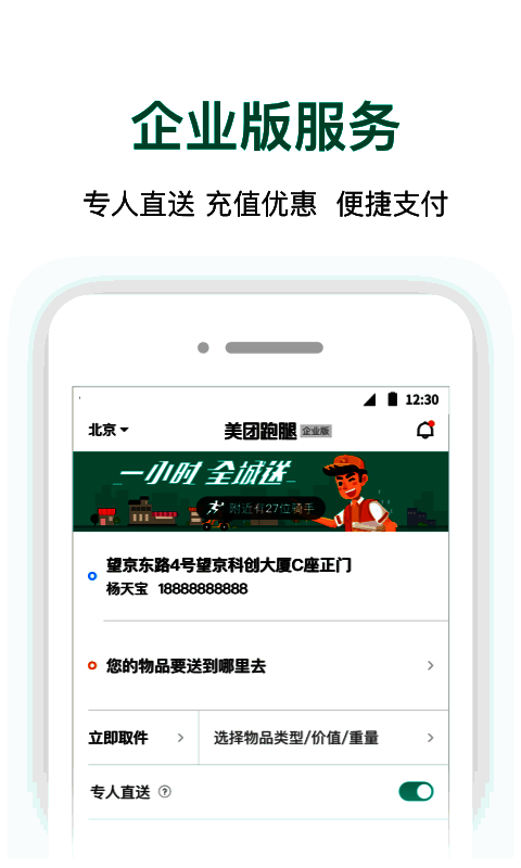 美团跑腿 app 是同城帮买帮送应用,用户输入商品名称和数量,在线支付配送费即可下单。跑腿员会第一时间前往选购,还能代买生活用品,满足个性化需求。