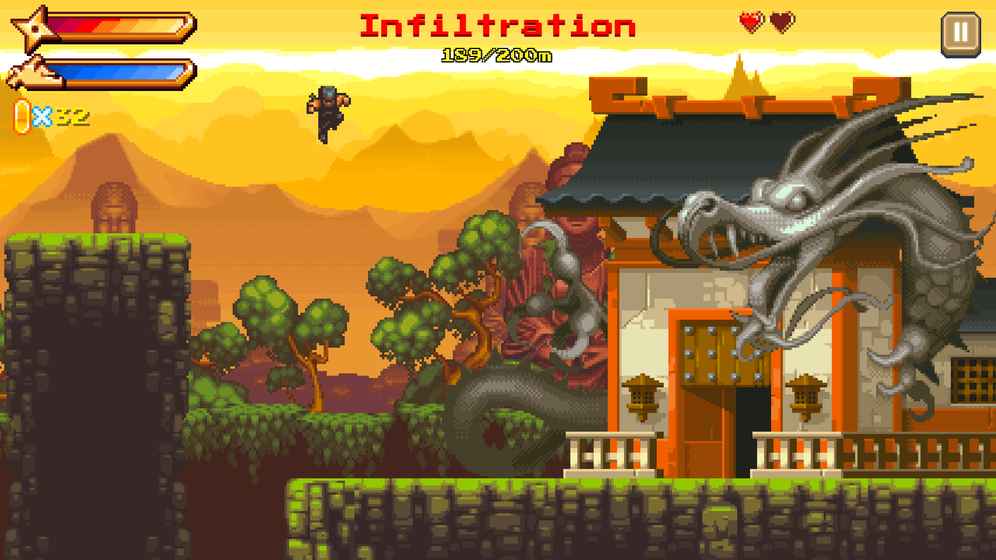 游戏仅设有三个操作:点击屏幕左侧实现跳跃,滑动左侧屏幕发动俯冲攻击,点击右侧屏幕发射忍者镖。俯冲攻击和忍者镖都有能量值限制,消耗后需等待一段时间才能恢复。玩家要运用这三个操作在场景中灵活穿梭,击败阻碍者、收集金币,同时提升自身各项属性,让游戏进程更顺畅。