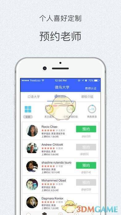 微鸟大学是全球领先的移动端一对一真人外教英语教育平台,提供系统化优质课程,还有免费的国际社区营造真实语言环境。能让用户在轻松氛围中快速提升英语口语能力,学习时可与世界各地老外交朋友,零基础同学30天能自由和老外聊天,一年达专业英语八级水平。