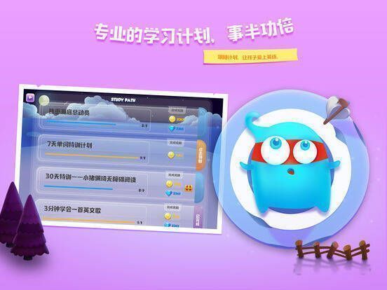 2、软件不仅有优质系统的英语学习内容,还为不同年龄段孩子量身定制清晰的学习计划。开启“英语总动员”,完成精心搭配的学习任务,孩子就能感受语言进步的快乐。