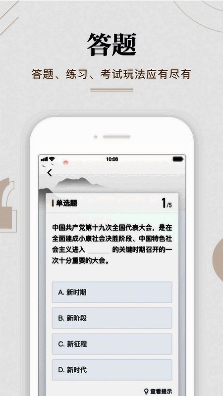 4、在线答题:定制在线学习答题,有文字题、音频题、视频题,还有每周一答、智能答题、专题考试等,助您不断攀登新高度。