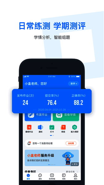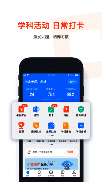 小盒老师 app 是一款专门为教师打造的优质家校沟通手机平台。它不仅是教师工作的得力助手,也是教师与家长互动交流的优质桥梁。在该平台上,老师和家长可以无障碍地进行一对一交流。同时,平台还为学生提供了同步教学资源,方便他们随时随地学习。