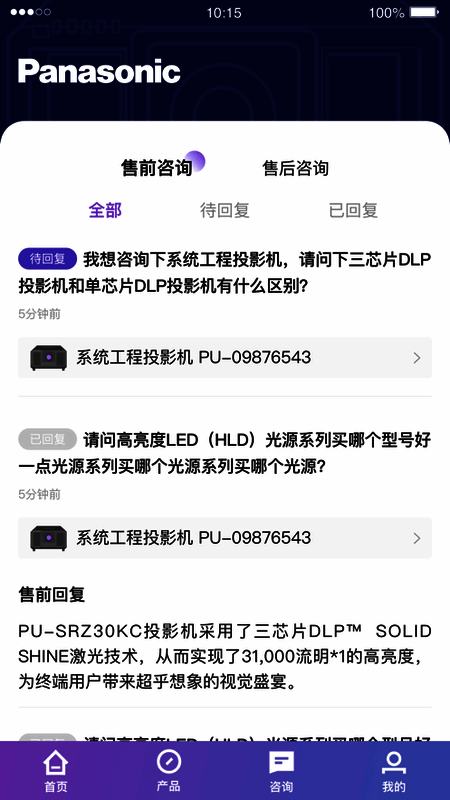 3. 若有疑问可直接咨询客服,软件内产品信息介绍全面,还配有图片(alt="松下投影机产品图片")。