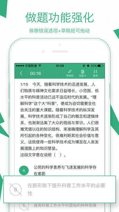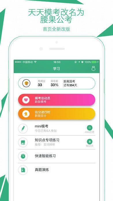 腰果公考 APP 是备考公务员必备的手机软件,涵盖行测和申论两大科目。每天打开手机浏览,满满都是知识点,能帮你解决公考中的难点与困惑。考公务员,选“腰果”就对啦!天天模考包含近十年国考、省考、政法干警等真题整卷,每道题都有细分知识点归属和精心撰写的专业解析。