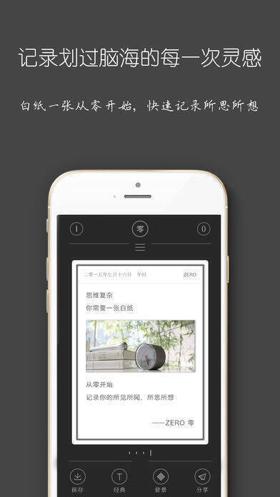 ZERO零是一款集图片制作与文本创作为一体的工具应用,支持快速分享至微信朋友圈、微博、QQ等主流社交平台。ZERO零期望大家的生活回归简单,以轻文艺的方式表达自我、体验慢生活,从零开始,记录生活点滴。