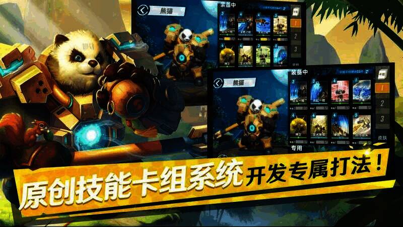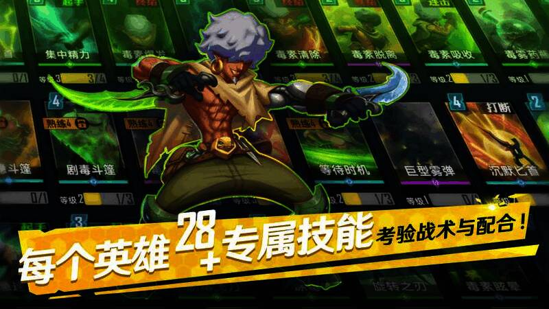 2、每位英雄都有28种以上的专属技能卡牌,可自由搭配,打造个性组合。