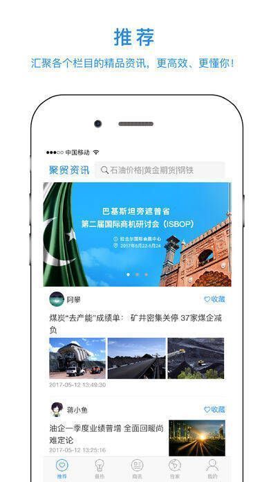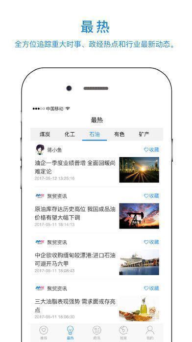 聚贸资讯APP由聚贸电子商务有限公司推出,是其唯一一款以客户为核心的APP。其涉及的栏目主要有推荐、最热、商讯、独家以及个人中心。该APP定位大宗商品、工业品领域,旨在为相关人士提供业内最新最全信息,用户通过APP端能全方位查看行业新闻、最热资讯、全球商讯、独家新闻等重要内容,全面覆盖石油、矿产、煤炭、有色、化工以及时评等行业。