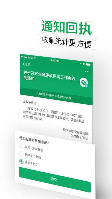 微哨的消息通知体系基于校园真实身份和完整组织关系,操作简便,步骤简易,零成本支持每日百万级的发送量,校内校外都能轻松送达。通知送达效果可控,时间、地点、附件信息突出,阅读统计可视化。