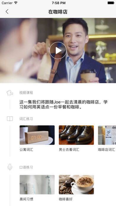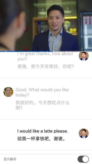 2、随时互动练习:每节课都有实用的口语互动练习,用户可与模拟人物一同练习,系统利用高级语音识别技术(ASR)了解语言习惯并打分。