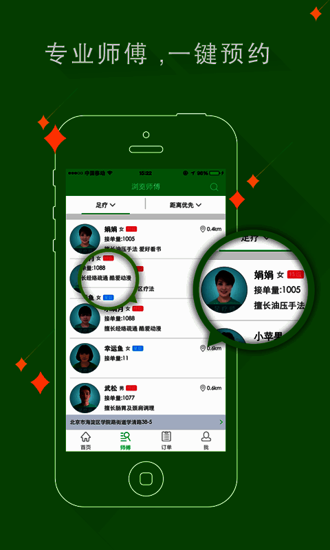 1、国内首个推出上门足疗服务的 O2O 平台。2、师傅非常专业,运营团队有十多年线下服务经验,对师傅的甄选、培训、考核及日常管理都很专业。3、安全有信赖,所有师傅上岗前经严格安全认证,包括心理考察和身份认证,还有近 10000 平米线下体验中心。4、低价又便捷,以不到实体店一半的价格享受更优服务,还能按自己时间安排上门服务。5、多种下单渠道,可通过 APP、微信公众号、400 电话下单。