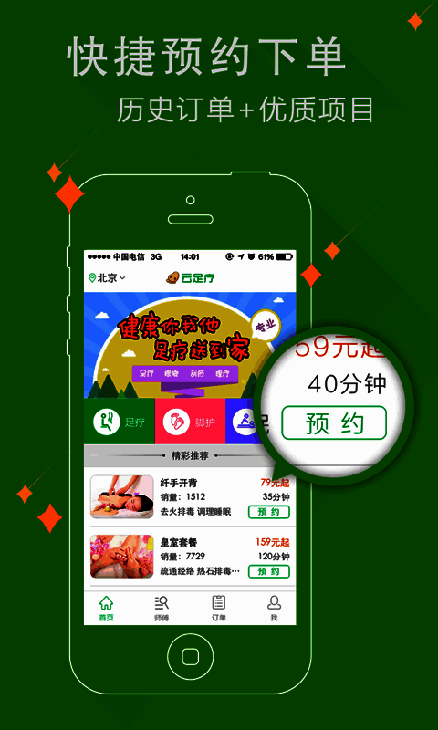 云足疗是提供中医推拿、足疗按摩等上门服务的 O2O 平台。平台汇聚众多专业技术精湛、素质良好、服务一流的手艺人。用户在手机上可在线查询、预约师傅,还能对服务评价,促进师傅改进服务,提升整体服务水平。