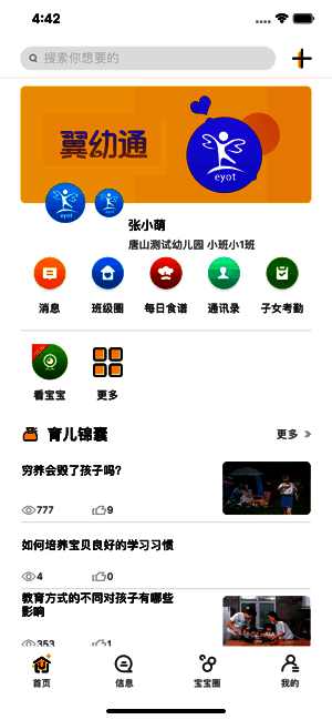 唐山翼幼通以电信宽带网为传输通道,考勤机和摄像头为信息采集终端。该软件集成了多种互联网技术,为学生提供出勤、看娃、上课圈、日常食谱和留言等功能。用户在家通过唐山翼幼通应用程序,就能远程观看孩子在园活动,还能和老师交流孩子在园生活情况。