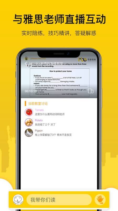 1、与雅思专业老师进行直播互动,老师实时陪练,深入精讲技巧,随时为你答疑解惑。