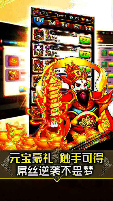 1. 休闲放置玩法,采用全自动战斗模式,只需搭配武将进攻副本,就能轻松获得高额收益与材料。