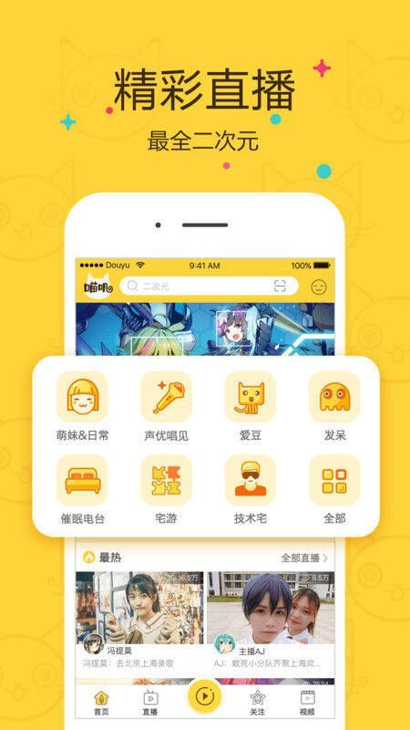 喵叽 app 是斗鱼旗下专注二次元的应用,提供海量二维直播与短视频内容,涵盖萌妹、优声唱见、爱豆、发呆、催眠电台、宅游、技术宅、动画、放映厅等。