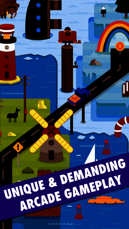 游戏时车辆会沿着道路自动直线行驶,玩家需在道路转到能连接两座小岛的合适位置时点击屏幕,搭建通路连接岛屿,防止车辆坠毁。据说这款游戏带来了八大主题和风格独特的奖励场景,还有超过30种车辆等待玩家解锁,游戏内容十分丰富。