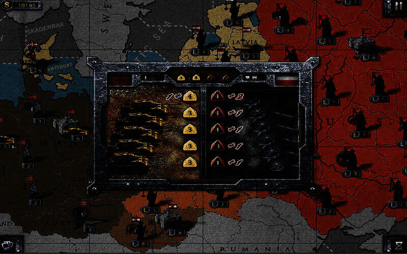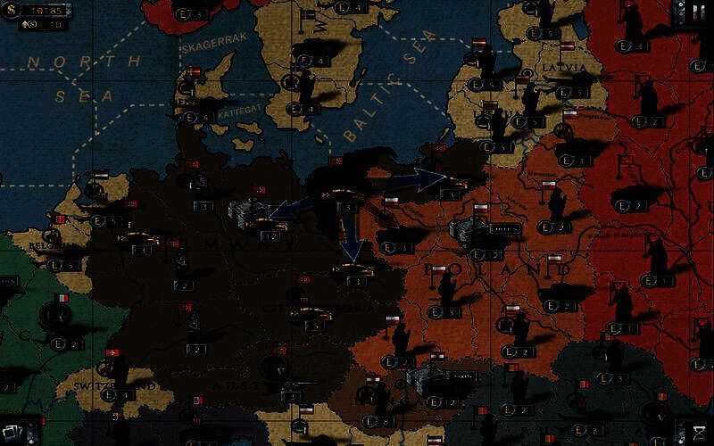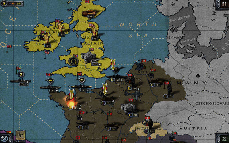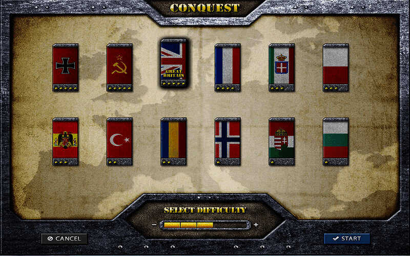 征服模式:玩家从12个轴心国和同盟国里选一个来称霸欧洲,其他势力有盟友、敌人和中立者。