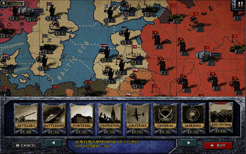 玩家需合理操作并分配士兵、坦克、大炮这三个基础军事单位来进行游戏。士兵产量高但攻击力一般,坦克攻击力高且完胜后可继续行动,大炮攻击士兵和坦克时对方无法还击。要随时对局势做出正确判断,因为游戏AI很出色。不同国家兵种属性有差异,如德国坦克最强但价格高,苏联士兵最便宜,英国海军最佳。同时,游戏要配合军事卡辅助下达指令。
