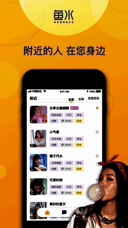 鱼水交友app是一个高品质的线上聊天交友平台,汇聚了各地高颜值的单身人士。无论你是帅哥还是美女,都能在这里找到另一半,还能结识更多兴趣相投的小伙伴。你可以在这里倾诉心情,总会有人懂你,既能扩大交友圈,又能随时查看附近在线的用户。