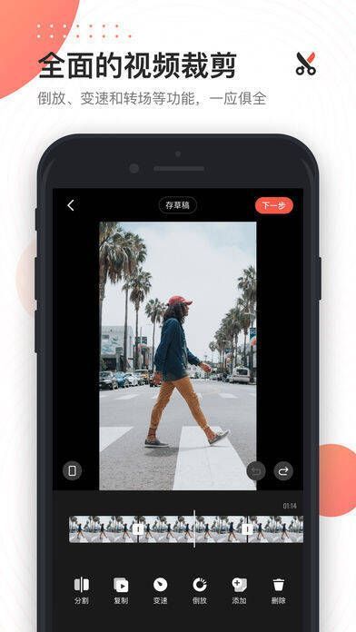 2、在导入视频界面会出现裁剪、分割、复制、变速、静音、倒放等选项,先裁剪截取需要倒放的片段,再点击倒放选项。制作好的视频可在各类短视频平台分享。