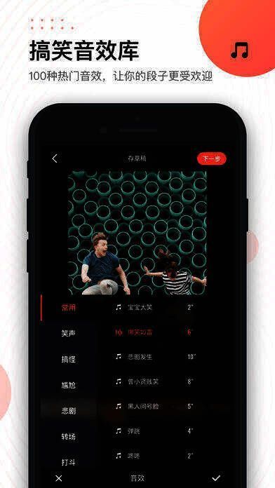 5、「配音」:不仅能添加音乐,还可添加音效到视频中。