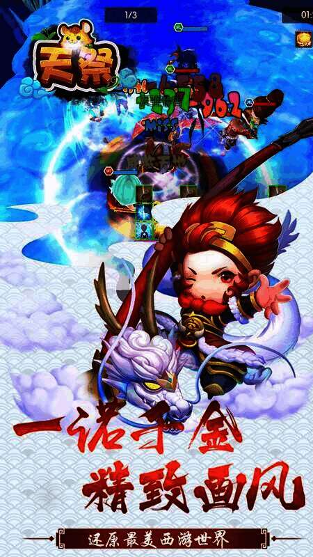 《天祭》是一款回合制角色扮演手游,以西游为背景,融合了角色扮演与激情PK元素。为了平定三界战乱,主角将化身斗战神转世,与魔王以及各路妖魔鬼怪、神佛展开生死竞速,抢夺三神器。游戏中有美轮美奂的奇幻场景、华丽畅爽的战斗画面、生死相随的仙魅神宠,还有极具魄力的国战BOSS战,让我们一同闯荡西游,看看谁才是真正的英雄!