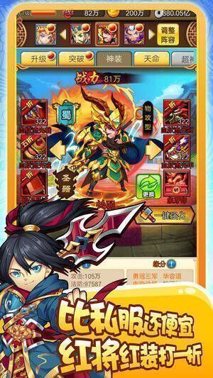 多名名将可出战附体,还有完善的装备锻造、强化以及兵书修炼系统,让你的装备更加强力,技能满屏炫酷,一招制敌,以一敌百,看谁能笑到最后。