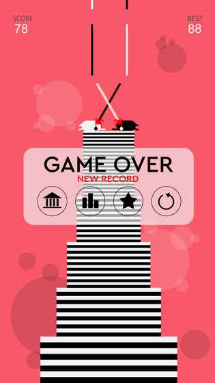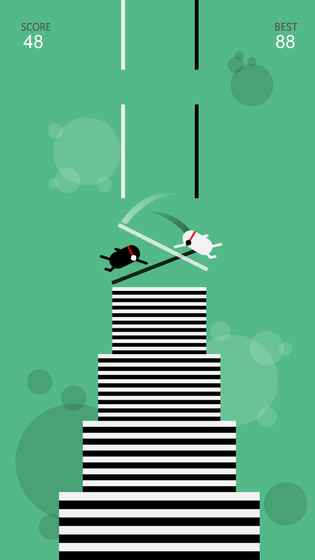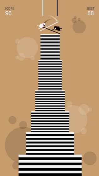 黑白两名建筑工的头顶会随机掉落黑色或白色的棍子。玩家点击屏幕交换两个建筑工的位置,让颜色对应,即黑色棍子对应黑色建筑工,白色棍子对应白色建筑工,这样他们就能接住同色棍子来搭建高楼。要是有不同颜色的棍子掉落在头上,建筑工就会被插死。