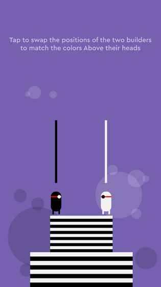 1、黑白建筑工头上随机掉落黑白棍子,玩家点击屏幕交换他们的位置,使颜色匹配。