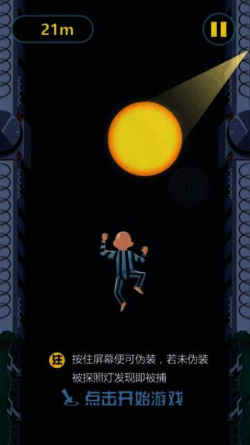 《越狱爬酷》属于休闲类游戏,虽画面一般,但玩起来很有意思。游戏玩法简单,按住屏幕就能伪装自己,若没伪装好被探照灯发现,游戏就会结束。
