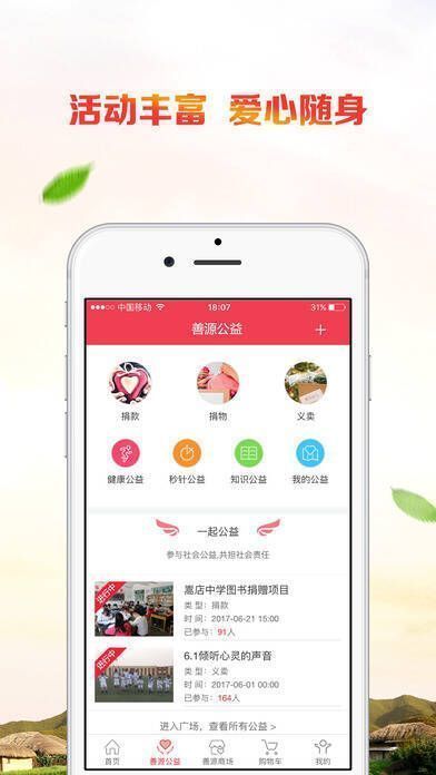 2、【善源公益】:可创建、参加志愿队,发布、参与公益活动,建立爱心专项资金,进行捐款捐物。